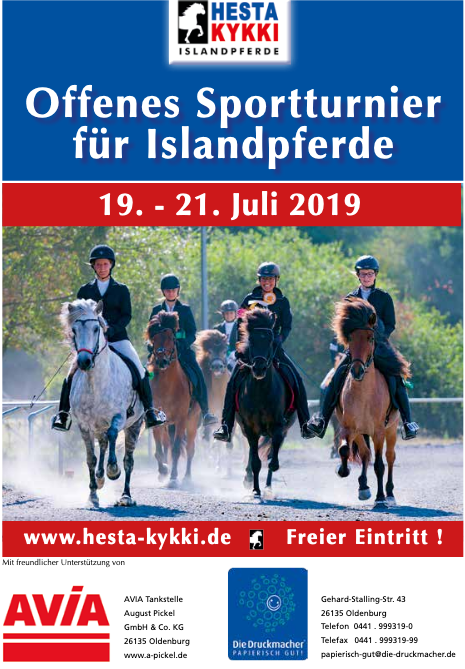 auch dieses Jahr veranstaltet unser Verein ISLANDPFERDEFREUNDE OLDENBURGER-LAND e.V. das beliebte Offene Sportturnier für Islandpferde vom 19. bis 21. Juli 2019 auf dem Island-pferdehof HESTA-KKYKKI der Familien Onken und Friedrich in 26209 Sandkrug, Ginsterweg 25.