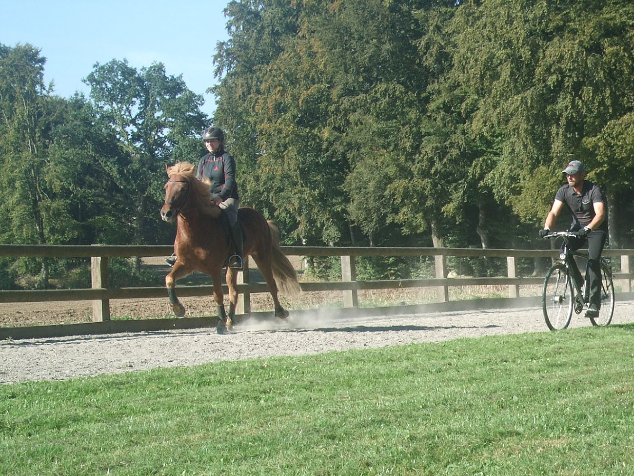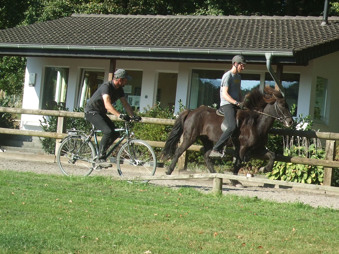 Gestärkt, durch leckere Pizza, und Kuchen (von unserem Lieblingsbäcker ;) ), ging es dann am Nachmittag weiter: Wir auf die Ponys – und Haukur aufs Fahrrad, oder zu Fuß, aber immer ganz nah dran.